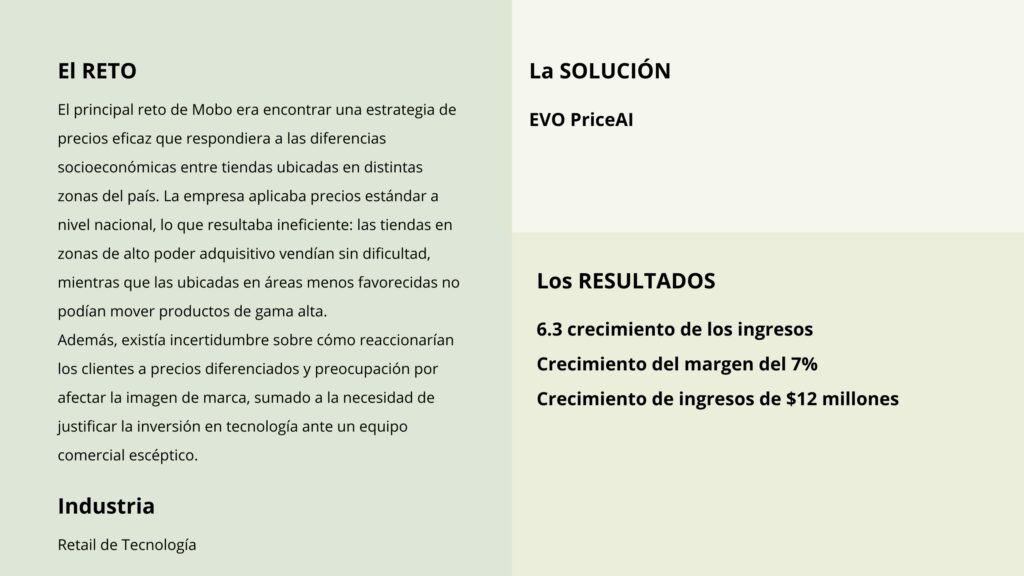 En el caso de Mobo, permitió implementar precios dinámicos por tienda, adaptados a las condiciones socioeconómicas locales y la elasticidad de la demanda. Esto generó un crecimiento en ingresos del 6,3 % y una mayor eficiencia operativa, sin afectar la percepción del cliente ni la marca.
